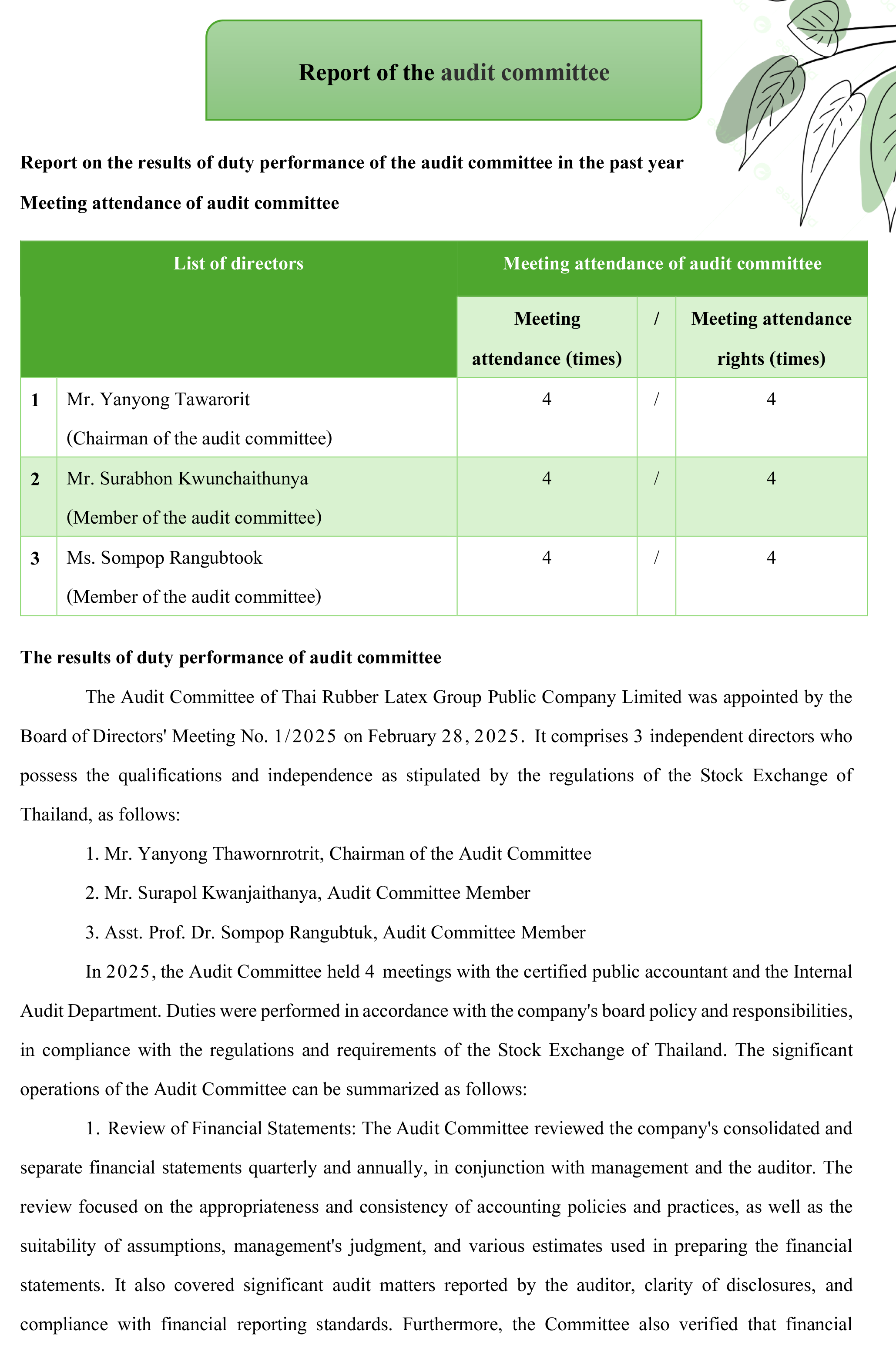 Thai Rubber Latex Group Public Company Limited engages in the production and distribution of concentrated latex. With a strong emphasis on sustainable development—economic, social, and environmental—the Company places great importance on selecting top executives who possess the necessary knowledge, capabilities, and vision that align with the Company’s long-term strategic growth. This ensures that the CEO position is filled by an individual with the appropriate experience, competencies, and leadership qualities.