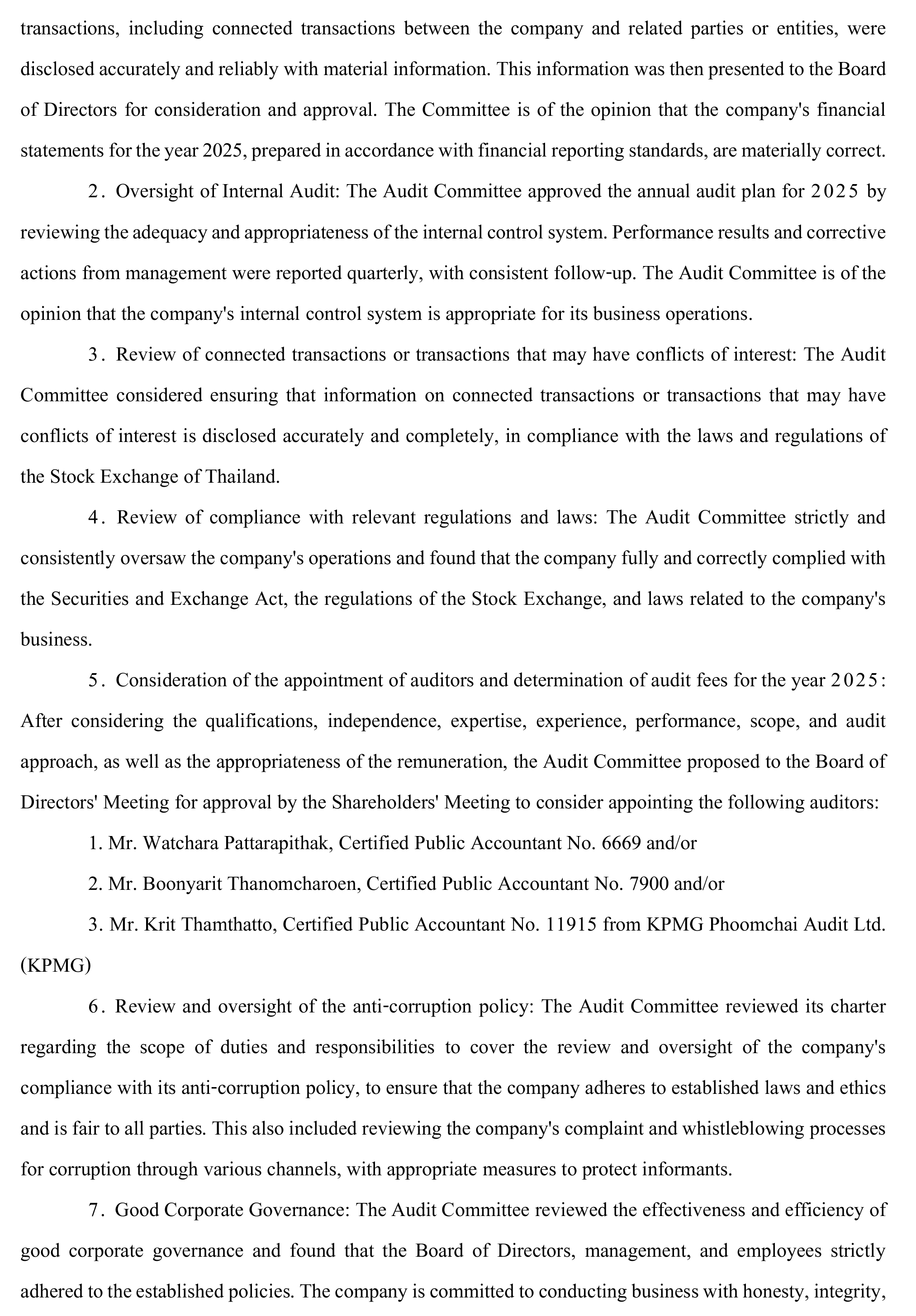 - Tracking and Monitoring Monitor and control the Company, subsidiaries and/or associated companies’ performance to achieve good operating results as targets and report to the Executive Committee and the Board of Directors every quarter, as well as seek opportunities to improve and develop for better results.